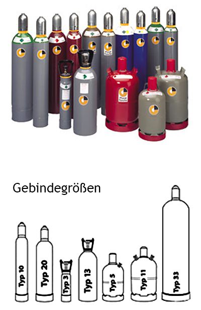 Die erhältlichen Gase: Acetylen, Argon 4.6, Kohlendioxid, Ballongas, Propangas, Sauerstoff 2.5, Schutzgas Sagox 18